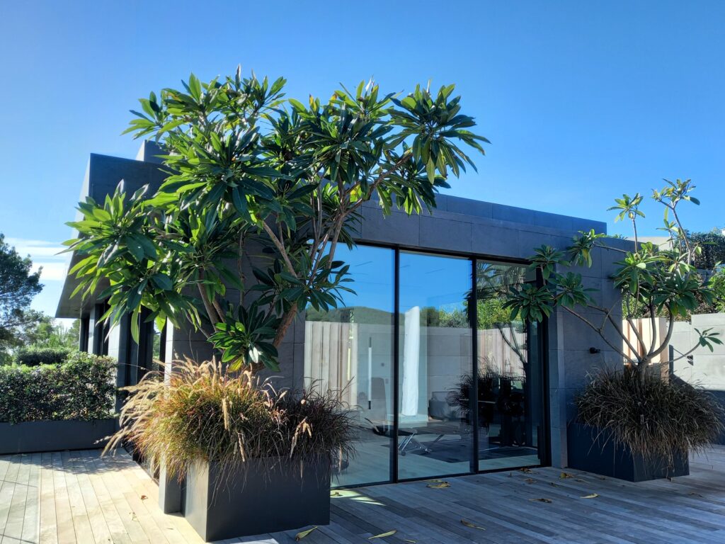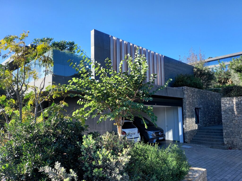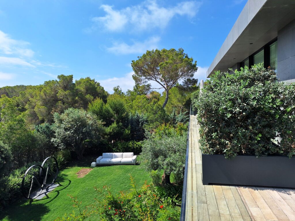 El proyecto parte de una volumetría horizontal y sobria que se adapta a la topografía del terreno, orientando las vistas hacia el mar y el bosque mediterráneo. La fachada combina piedra natural gris, vidrio, aluminio y madera, empleando un lenguaje contemporáneo y atemporal que refuerza la pureza formal del conjunto.