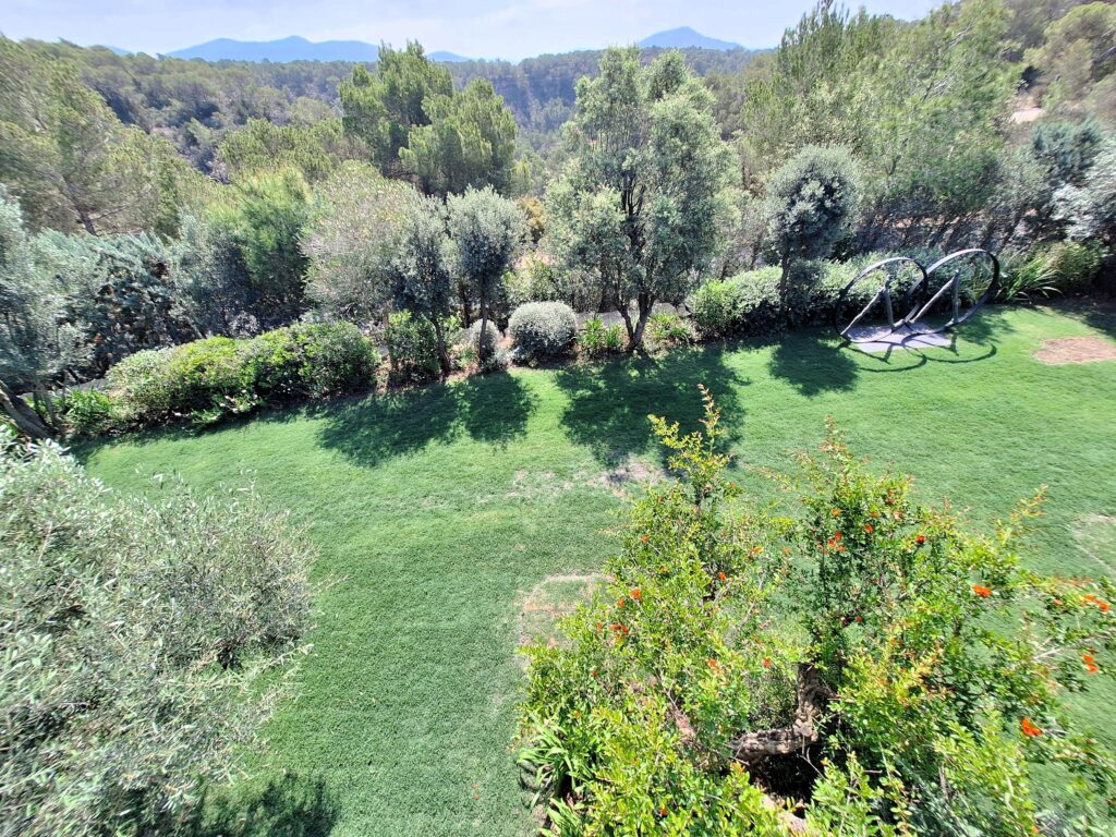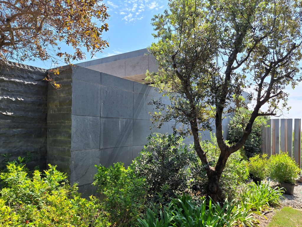 El jardín, diseñado como una extensión viva de la vivienda, aporta frescura, serenidad y color al espacio exterior, suavizando la rotundidad geométrica de la construcción. Con el paso del tiempo, la vegetación ha crecido y madurado, envolviendo la casa en un ambiente de calma y armonía. El contraste entre la piedra gris de la fachada, el verde intenso de las plantas y el azul del cielo genera una atmósfera vibrante en la que la naturaleza completa y transforma la arquitectura.