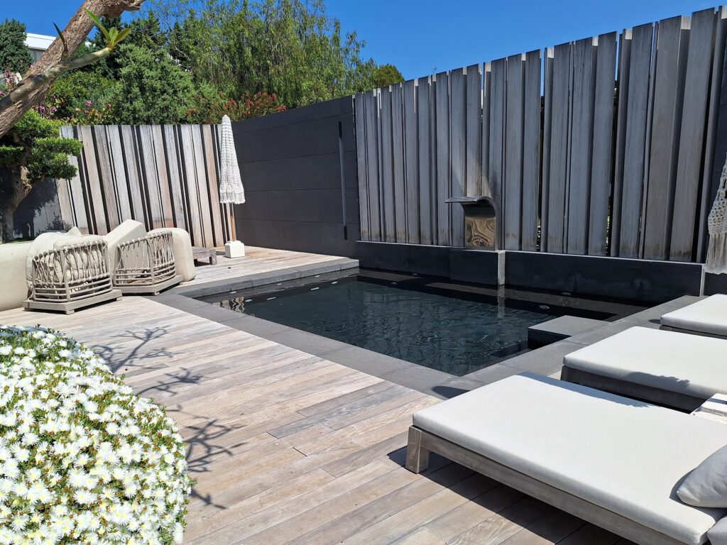 La piscina, enmarcada por muros de piedra y madera, constituye un refugio de privacidad y serenidad. En el nivel superior, las terrazas con barandillas de vidrio permiten una inmersión total en el paisaje, diluyendo los límites entre interior y exterior.