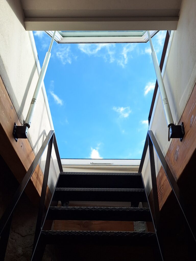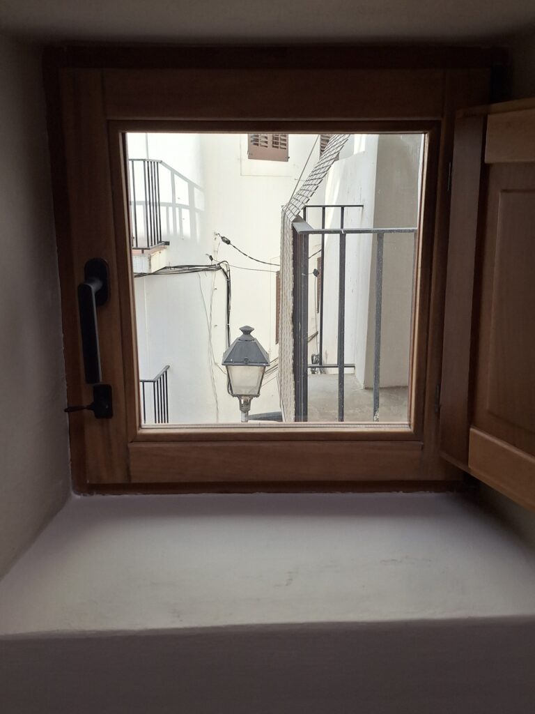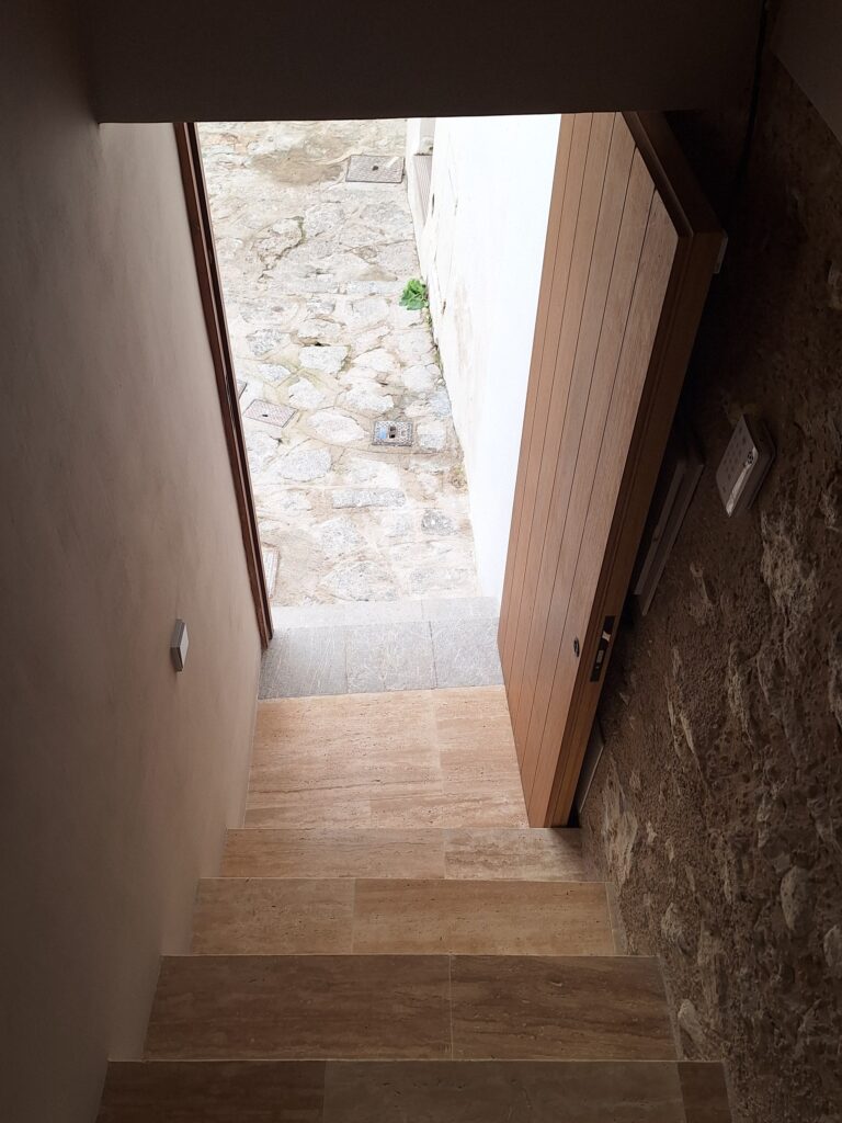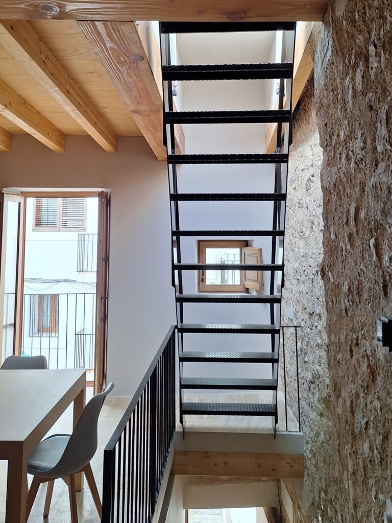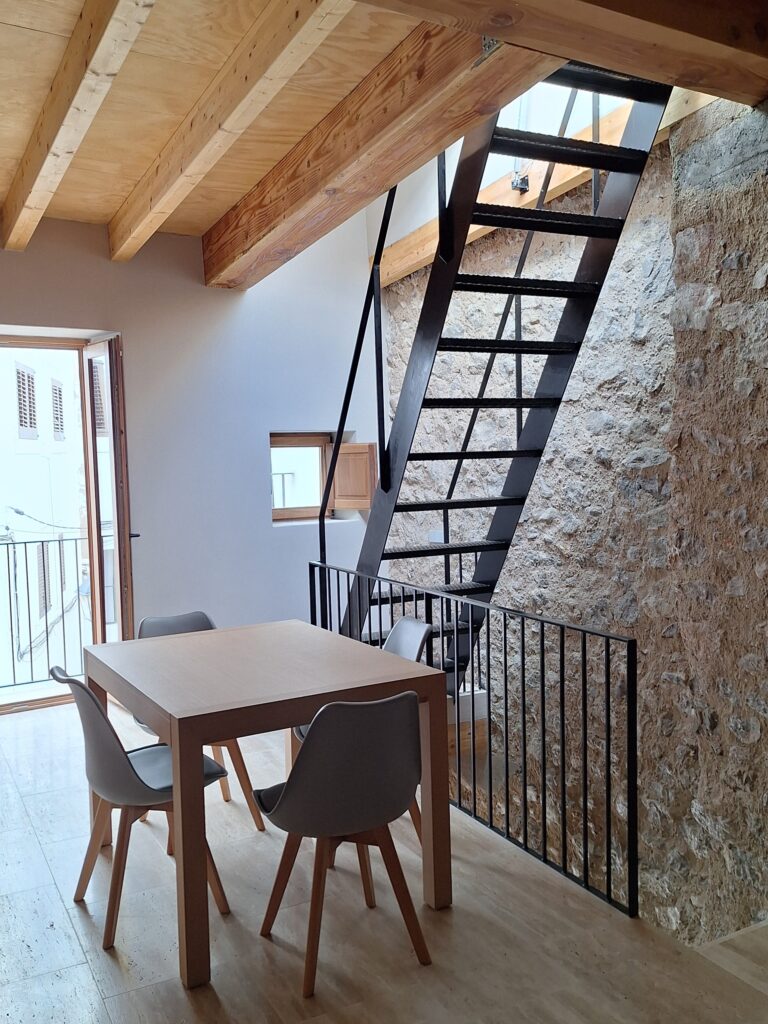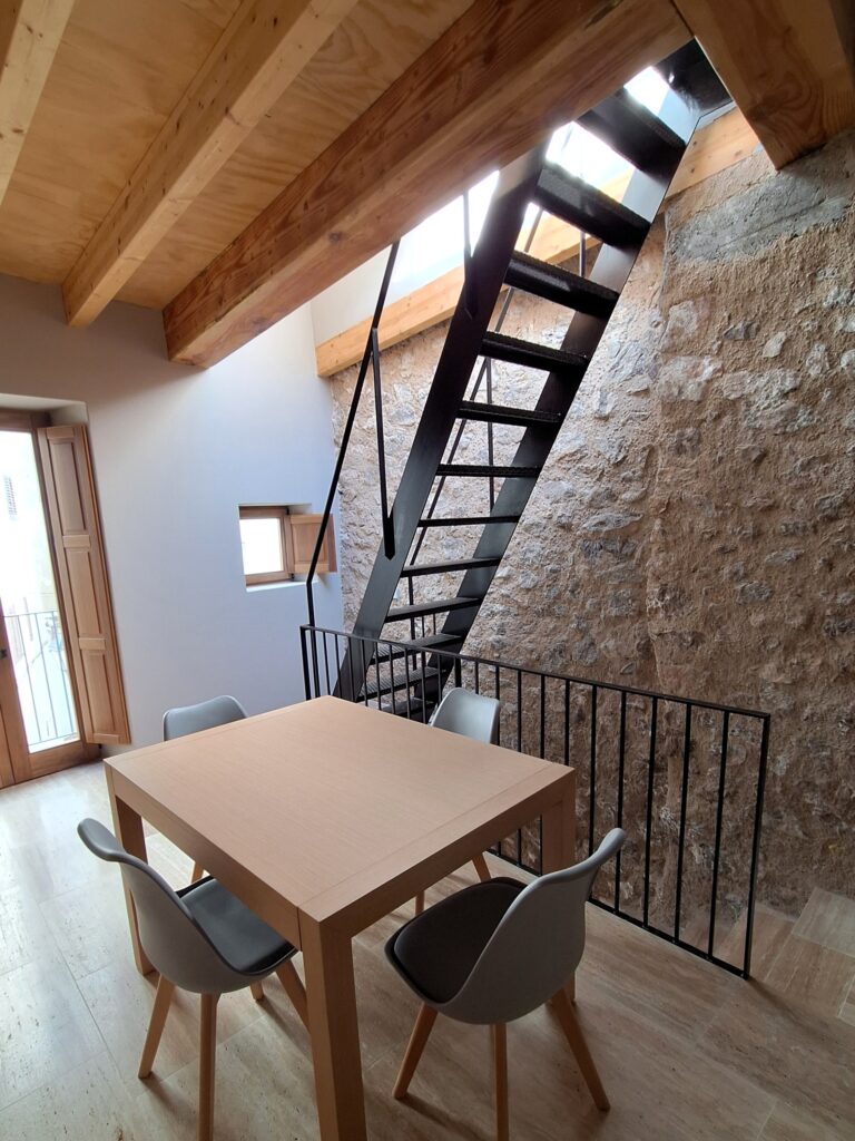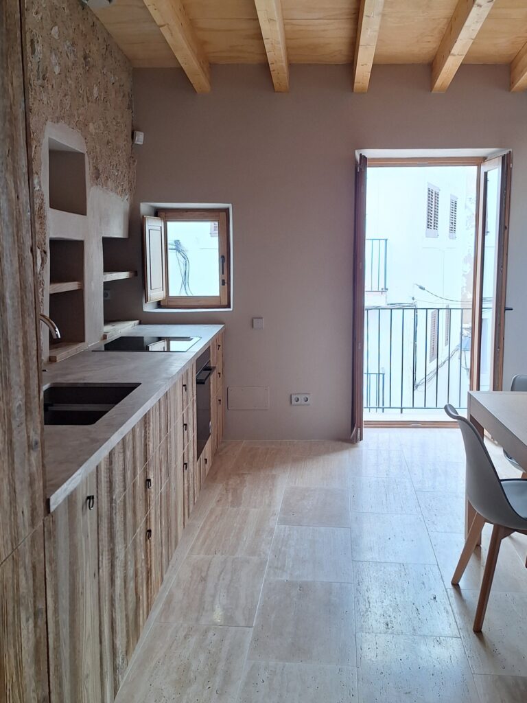 Los huecos fueron estudiados con precisión para mantener la tipología y escala propias de Sa Penya, incorporando además un lucernario abatible que conecta con la cubierta y permite la entrada de luz cenital, inundando el espacio de cocina–comedor–salón y reforzando la sensación de amplitud.