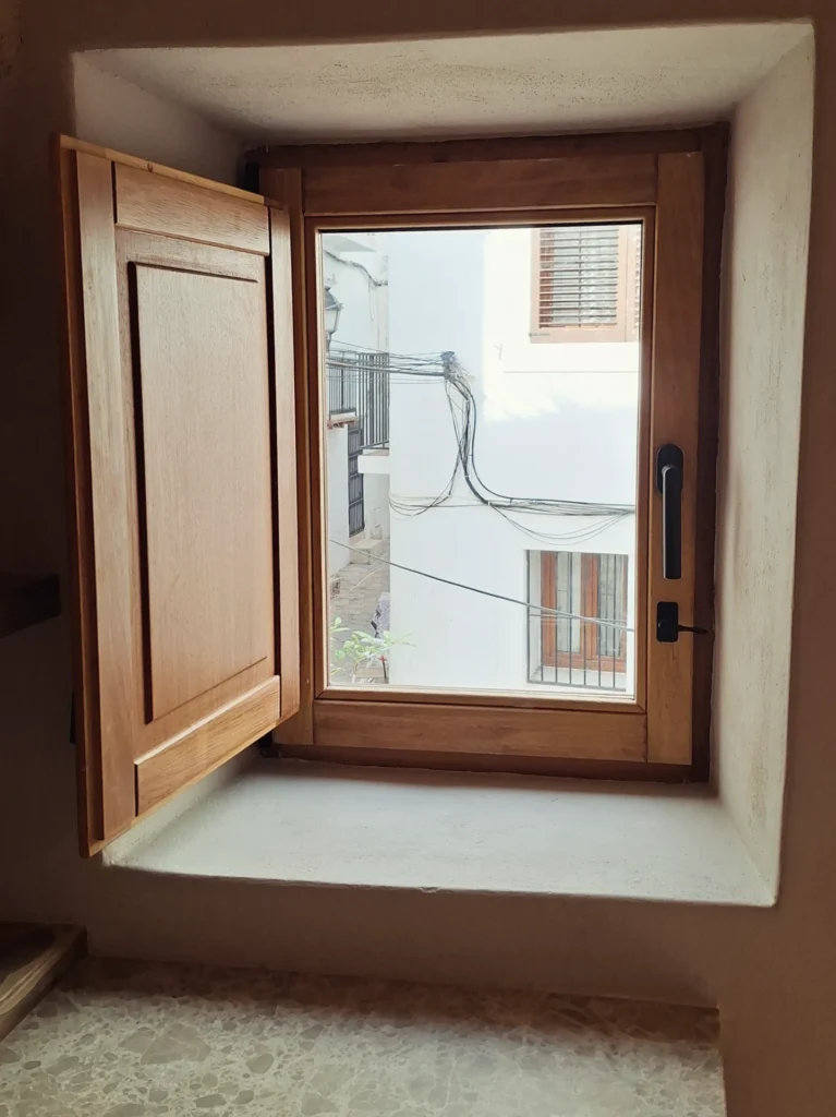 Las carpinterías de madera maciza, diseñadas a medida, respetan las proporciones tradicionales del barrio y contribuyen a preservar su identidad arquitectónica.