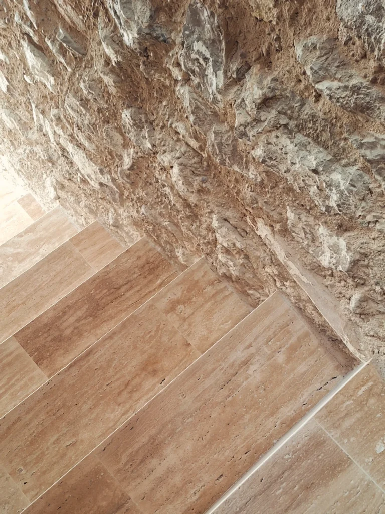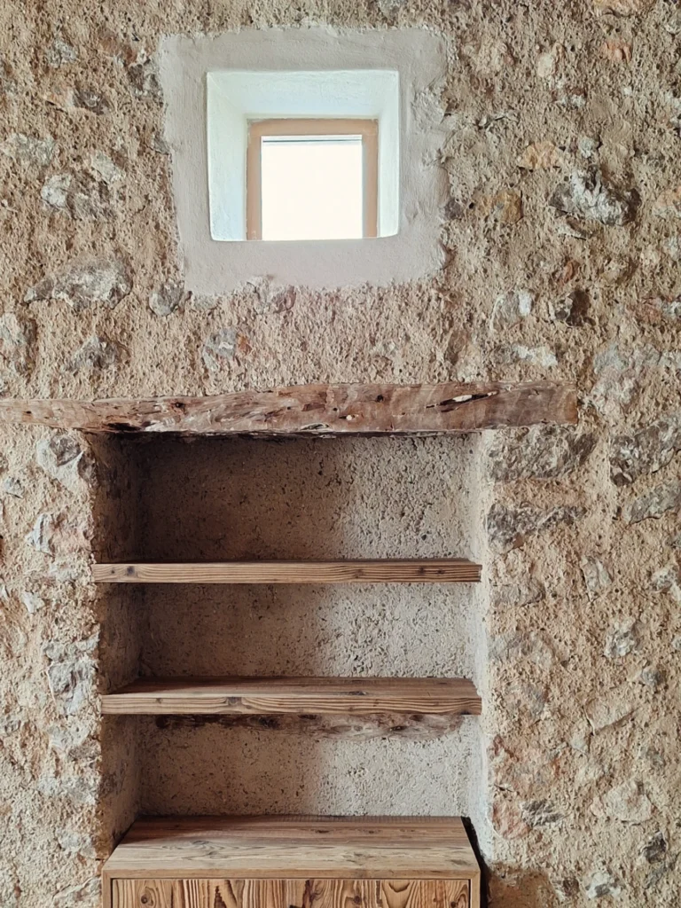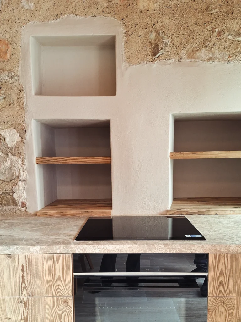 Los acabados en suelos y paramentos, los tonos terrosos suaves, las texturas naturales y el uso honesto de materiales como la madera, la piedra natural y el hierro configuran una atmósfera serena, cálida y equilibrada, donde cada elemento ocupa su lugar sin artificio.