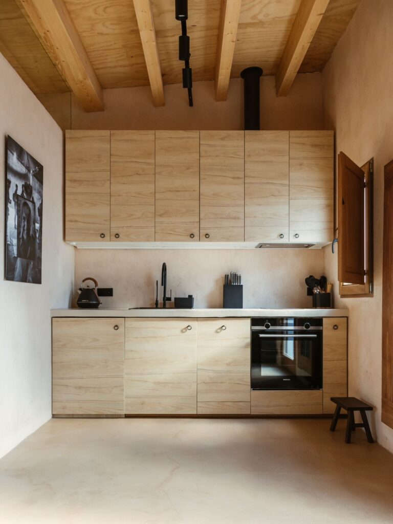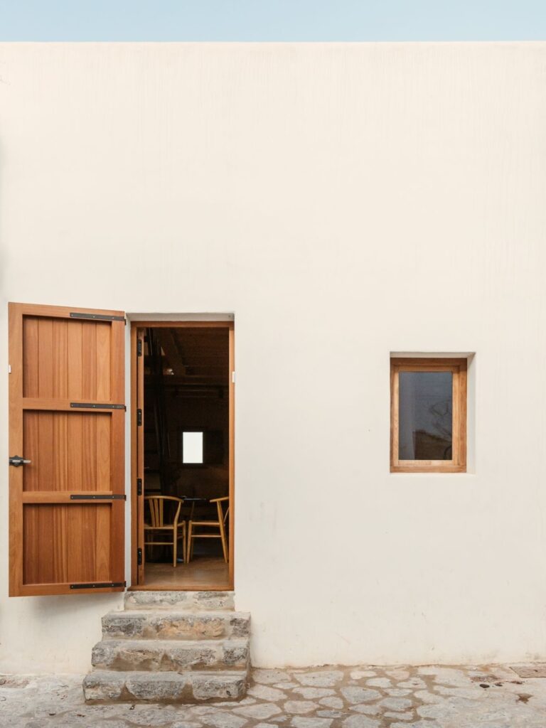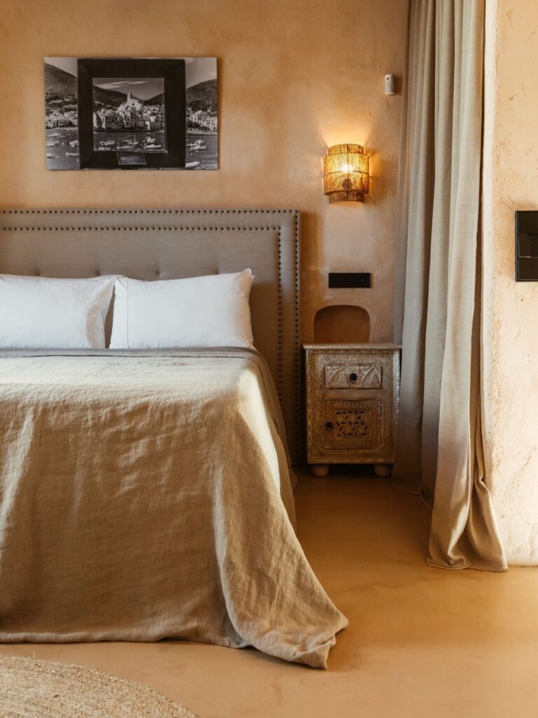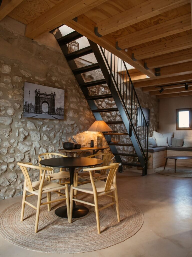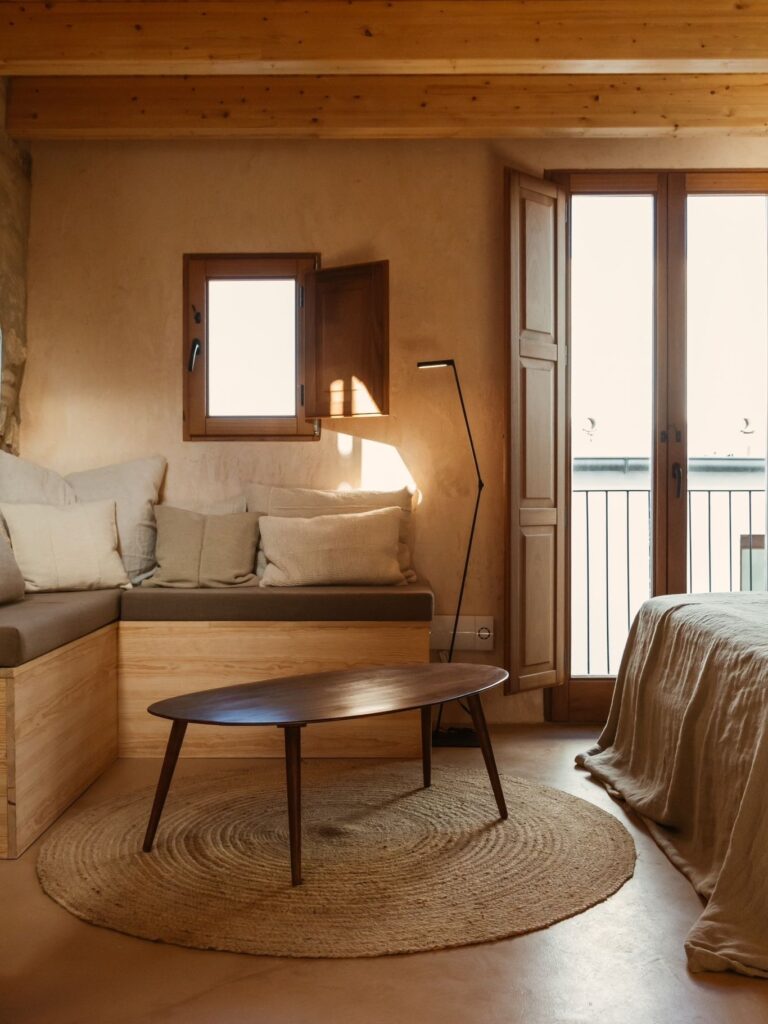 El diseño interior combina la pureza de los materiales con la calidez de la luz. Los muros de piedra natural vistos, los enlucidos de cal, el suelo continuo de microcemento, las carpinterías de madera maciza, los textiles de lino, las lámparas de yuca y los tonos terrosos aportan una sensación de sosiego y autenticidad.