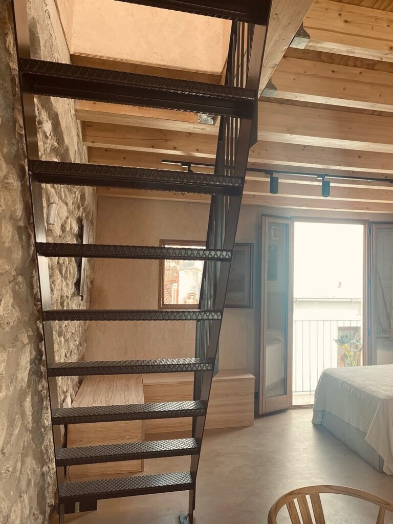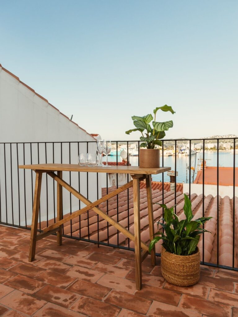 Una escalera de hierro negro, ligera y de estilo industrial, asciende hasta una terraza transitable que ofrece vistas abiertas al mar, al puerto y a Formentera.